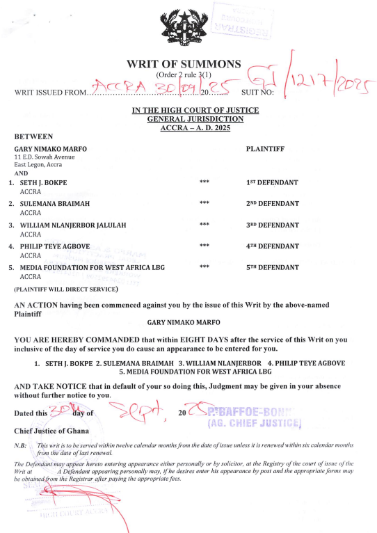 Mr. Nimako in the suit names Seth J. Bokpe, a journalist with Fourth Estate, Sulemana Braimah, Executive Director for MFWA, William Nlanjerbor Jalulah, Philip Teye Agbove, and the Media Foundation for West Africa as defendants.
