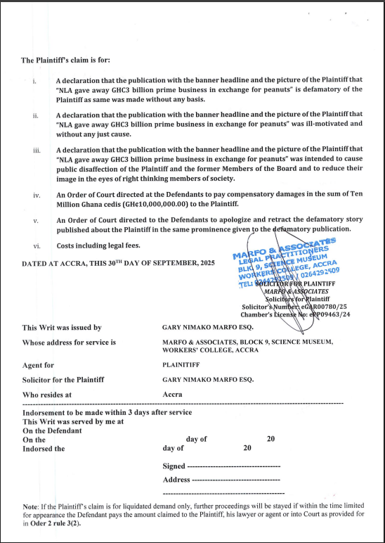 Mr. Nimako in the writ argues the publication, which carried a banner headline and included his photo, was defamatory, ill-motivated, and intended to damage his reputation and that of former board members of the NLA.