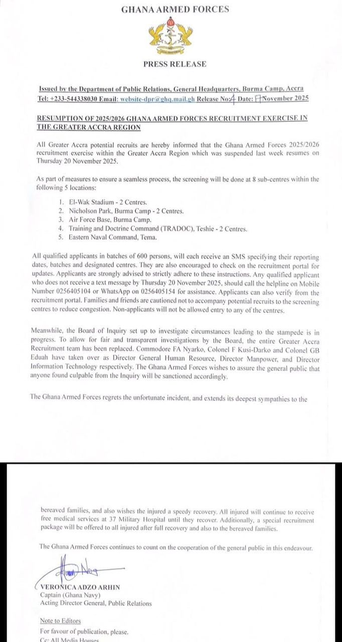 The Ghana Armed Forces (GAF) will resume its recruitment exercise on Thursday, 20th November 2025, within the Greater Accra Region. This follows the implementation of measures aimed at ensuring that all potential recruits are properly accommodated during the process.