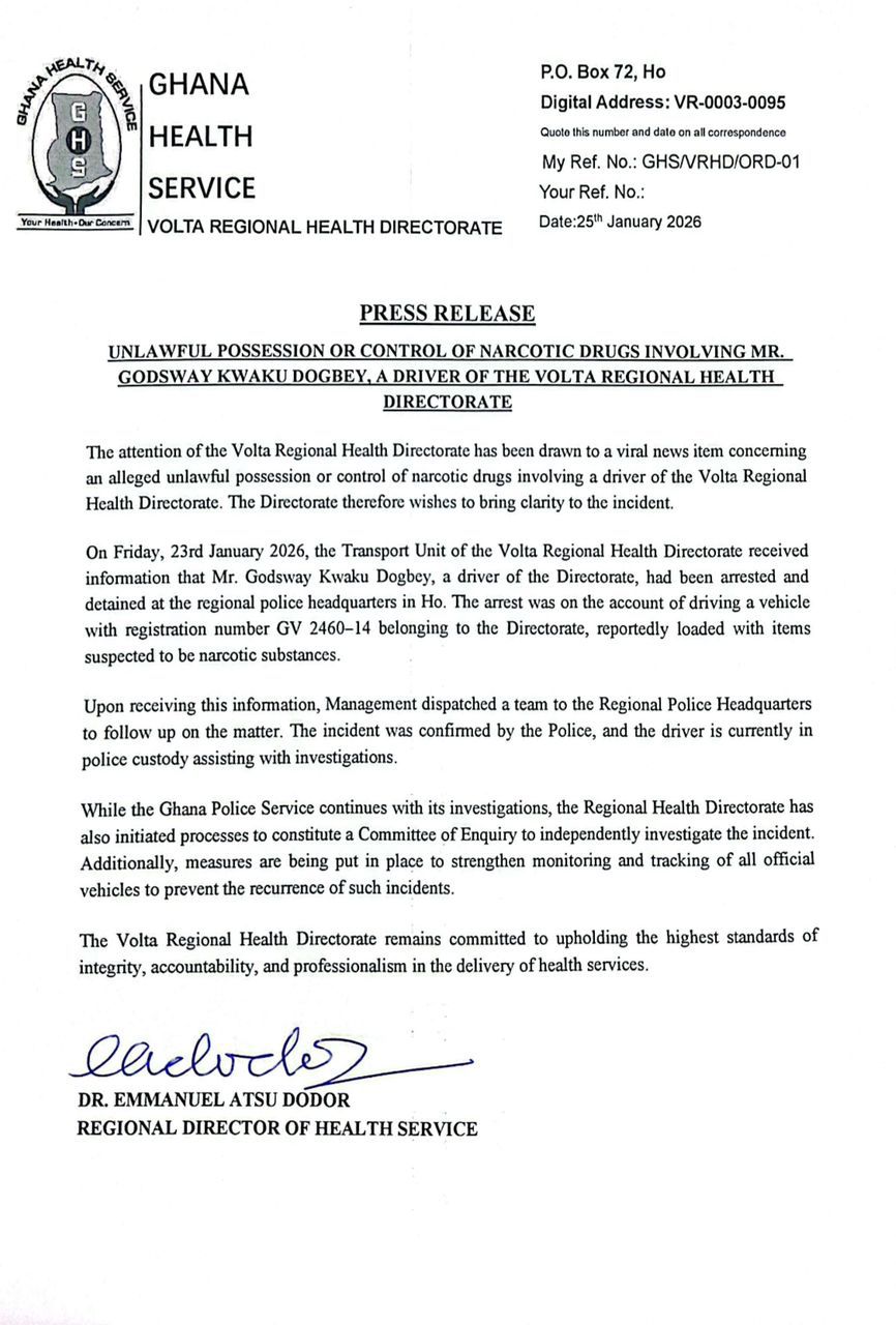 The Volta Regional Health Directorate has confirmed the arrest of one of its drivers, Mr Godsway Kwaku Dogbey, by the Ghana Police Service in Ho over the alleged unlawful possession or control of suspected narcotic substances.