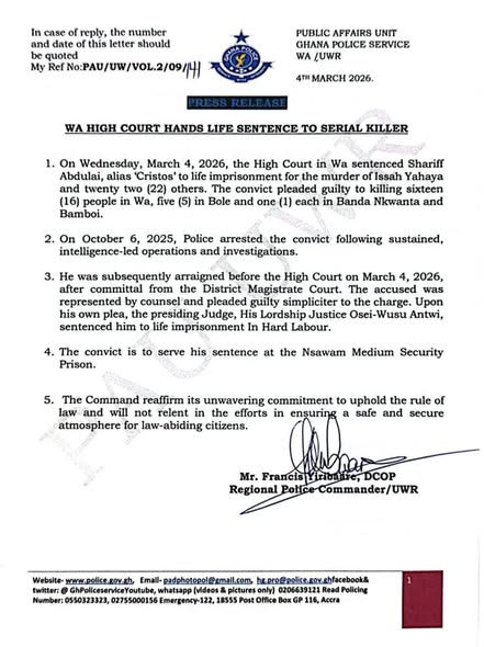 “On Wednesday, March 4, 2026, the High Court in Wa sentenced Shariff Abdulai, alias Christos, to imprisonment for life for the murder of Issah Yahaya, 22 years,” the statement said.