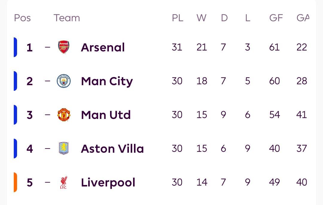 Arsenal’s win lifted them to 70 points from 31 matches, extending their advantage at the top and putting more pressure on the defending champions. City, who have played one game fewer, now sit on 61 points from 30 matches, leaving them nine points behind the Gunners in the title race.