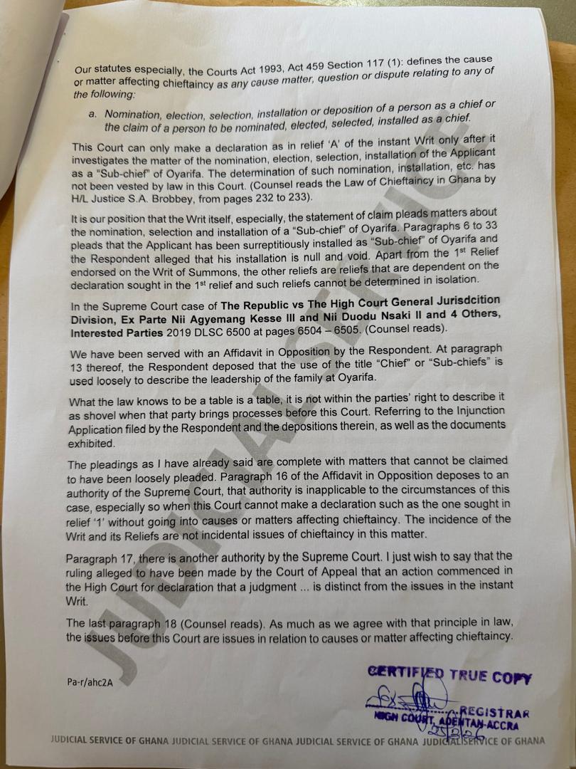 “The determination of such nomination, installation, etc., has not been vested by law in this Court,” Counsel said, pointing to the Law of Chieftaincy in Ghana by H/L Justice S.A. Brobbey, pages 232-233.