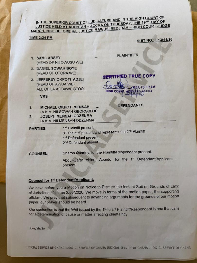 The La Agbawe Stool had sued Michael Okpoti Mensah, also known as Nii Sowah Gborgblor/Nii Djata (1st Defendant), and Joseph Mensah Odzenma (aka Nii Mensah Odzenma) (2nd Defendant), over the installation of the 1st Defendant as the Sub-Chief of Oyarifa.
