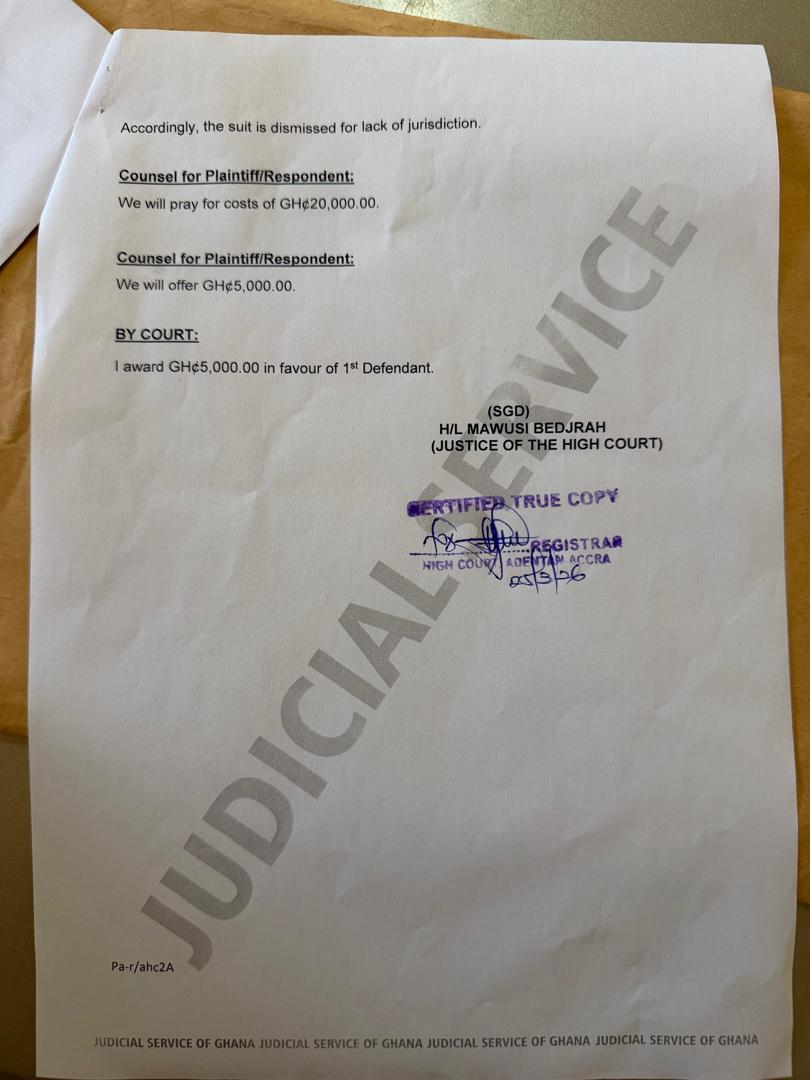“Accordingly, the suit is dismissed for lack of jurisdiction,” the Court ruled before awarding a cost of GH¢5,000 against the Plaintiffs (Respondents) in favour of the 1st Respondent (Applicant).