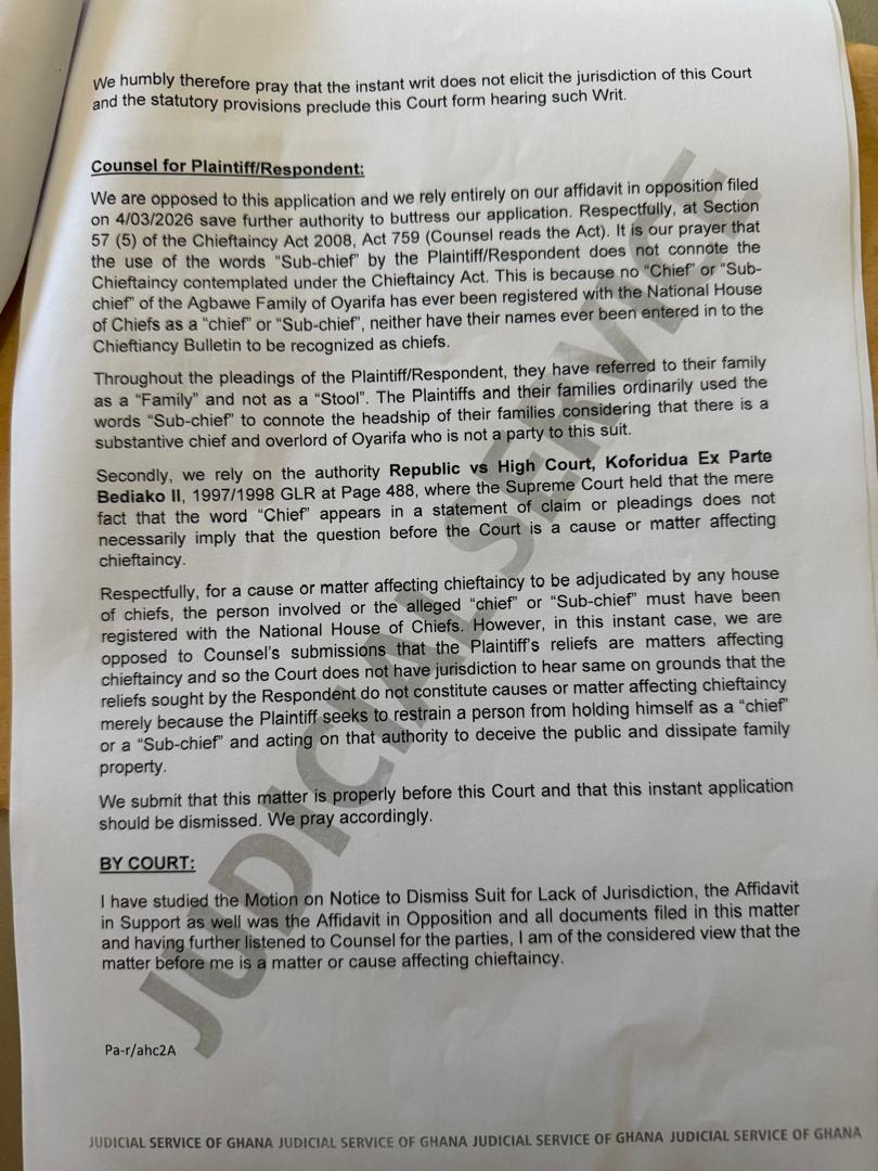Justice Bedjrah, the presiding Judge, after hearing submissions, said the matter before the Court pertains to chieftaincy, and the Court does not have jurisdiction to entertain it.