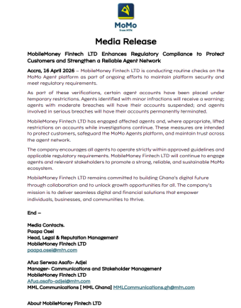 In a media release issued in Accra on April 16, the company said it has begun routine verification exercises across the MoMo agent platform to ensure adherence to regulatory standards and enhance system security.