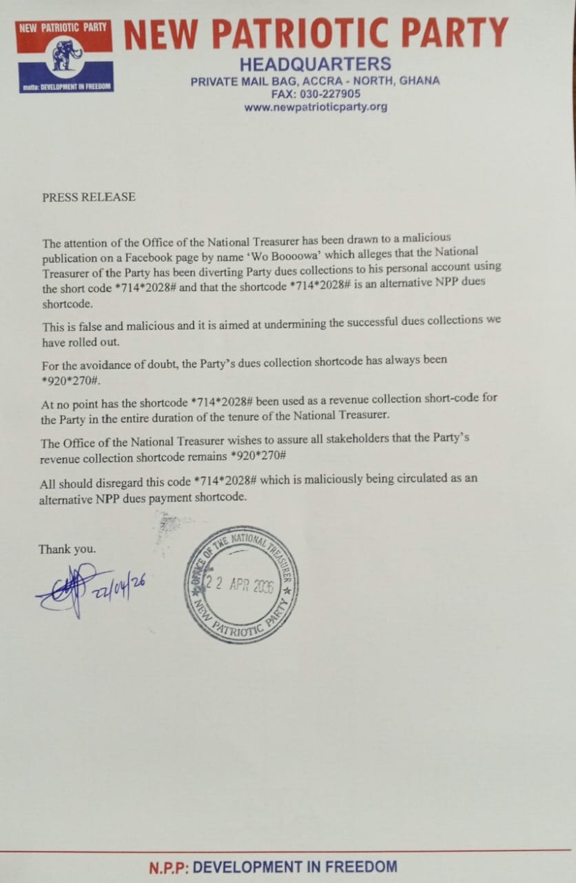 The Office clarified that the party’s official dues payment short code has always been *920*270# and has not been changed at any point. It further stressed that the short code *714*2028#, which is currently being circulated online, is not associated with the NPP and should be disregarded.