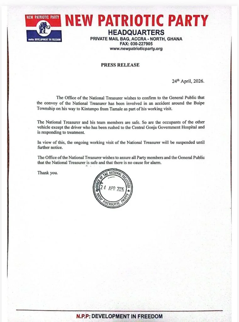 In a press release dated April 24, 2026, the Office of the National Treasurer disclosed that the incident occurred near Buipe Township while the Treasurer was traveling from Tamale to Kintampo as part of his Accounting to the People Tour.